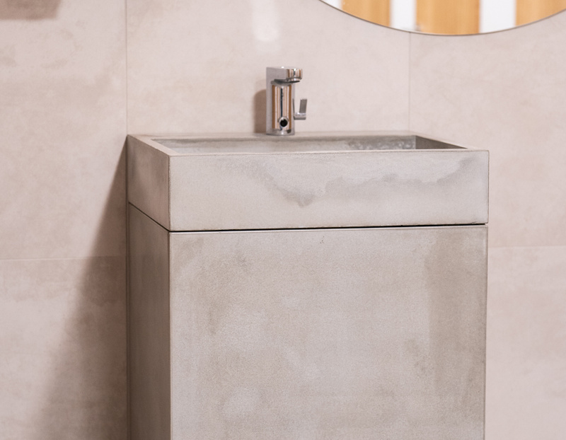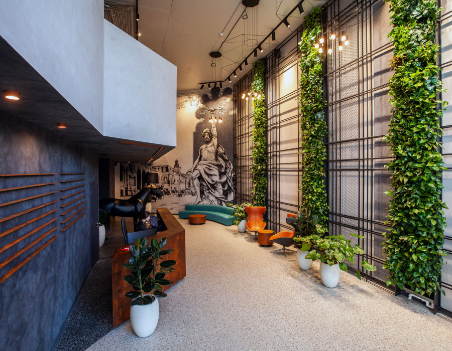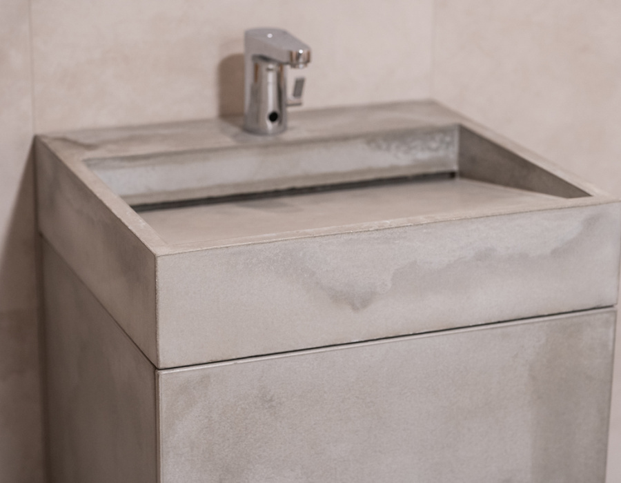 Realizare: pereți și chiuvete din ciment de rășină Microvelray®, acoperire cu efect de rugină Oxyrust pentru mese, lifturi, rafturi și ghișeu de recepție al complexului arhitectural Jauna Teika